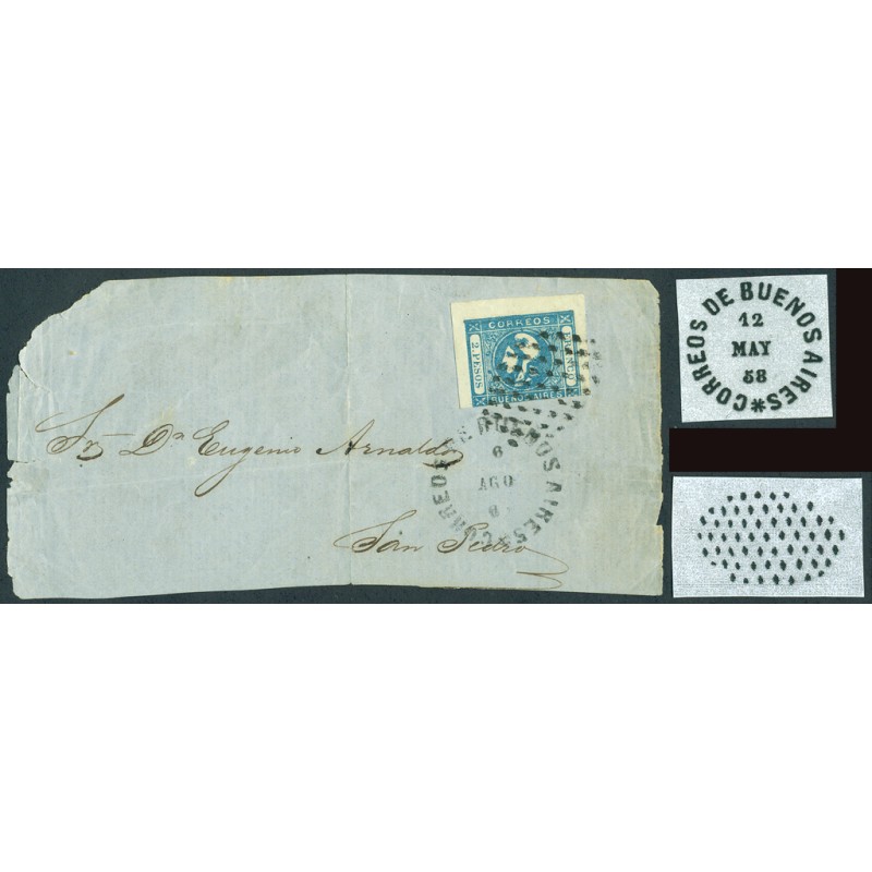 2p. AZUL, FRAGMENTO CIRCULADO DE BS.AS. A SAN PEDRO, CON MATASELLO BS.AS. MUDO (+20%) PUNTOS 7×7 EN 11 LINEAS Y FECHADOR CENTRAL GRANDE (6AGO62)